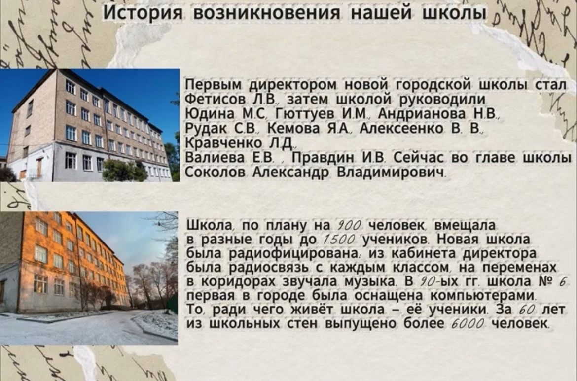 В рамках выполнения индивидуального проекта обучающиеся 10‑го класса Катков Демид и Бутырин Тимофей подготовили инфографику на тему «История школы № 6». В работе освещены ключевые этапы развития образовательного учреждения, особое внимание уделено сотрудникам школы — участникам Великой Отечественной войны. Авторы собрали и систематизировали биографические сведения, архивные данные о педагогах школы, внёсших вклад в Победу. Выбор темы продиктован знаменательным событием: в текущем учебном году наша школа отметила 60‑летний юбилей. Проект способствует сохранению исторической памяти и укреплению патриотических ценностей среди учащихся.