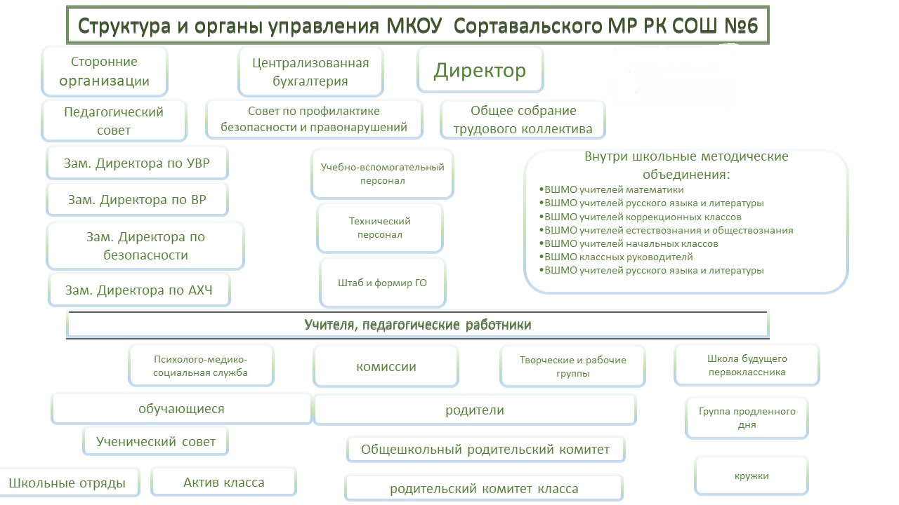 Педагогический совет - орган управления педагогических работников, Устав ОО, Положение о педагогическом совете (в состав входят все педагогические работники, (председатель директор школы Соколов Александр Владимирович, секретарь Чуйкина Эльвира Анатольевна).